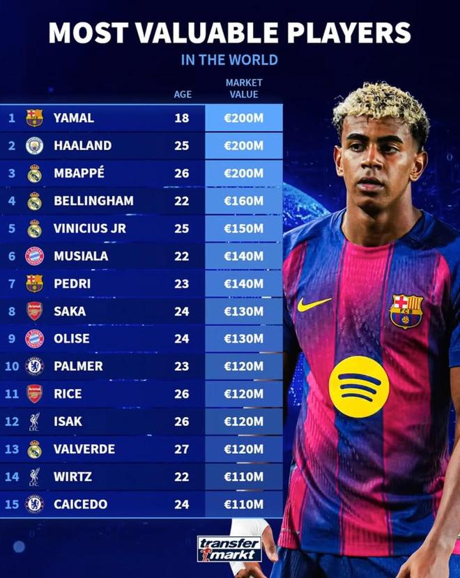 - 德轉(zhuǎn)列世界足壇身價前15:亞馬爾、哈蘭德、姆巴佩2億并列第一